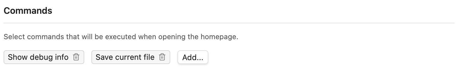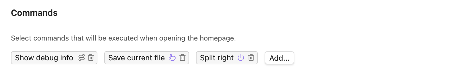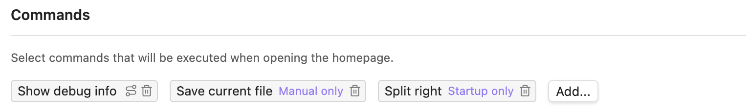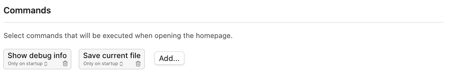 4.0 added the ability to set certain commands as only activating during startup or when opening the homepage manually. This was intended to serve some of the same purposes as creating arbitrary homepages - people might want to use commands at certain times but not others. Initially, I considered making this option a dropdown on a separate line, in slightly smaller text:
